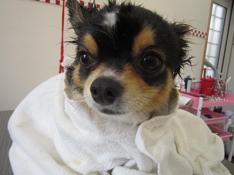 タオルにくるまれて、安心してますよ!
